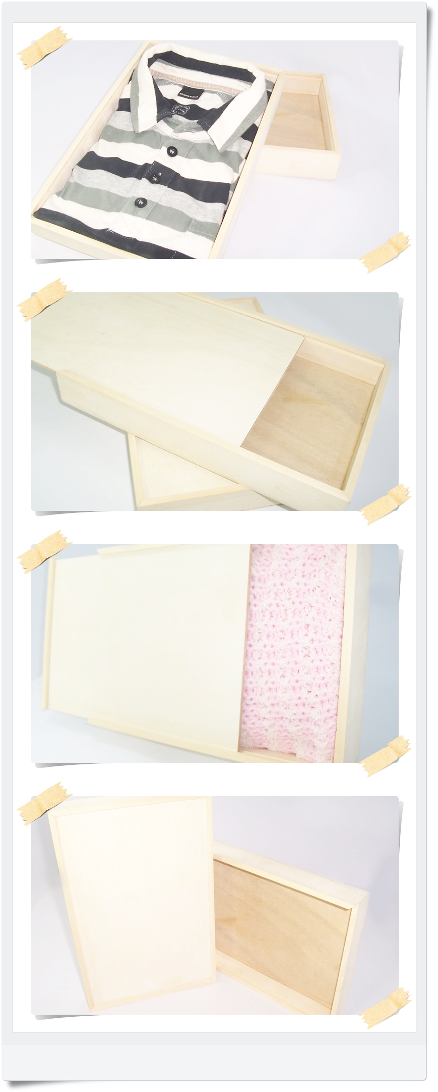 ตัวกล่องผลิตจากไม้สน ต่อชนเข้ามุม45องศา ฝากล่องด้านบนและพื้นกล่องด้านล่างทำจากไม้อัด